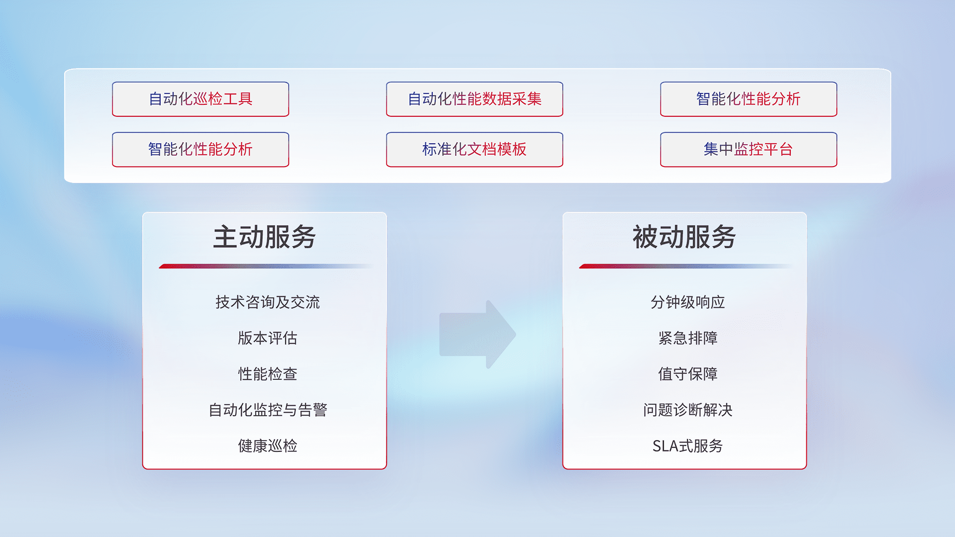 智能化工具和标准化文档,,保障服务质量,,,提供主动服务(包含技术咨询、、、、版本评估、、性能检查、、、自动化监控与告警、、、健康巡检)和被动服务包含(分钟级响应、、紧急排障、、值守保障、、、问题诊断解决、、、、SLA服务)。。。。